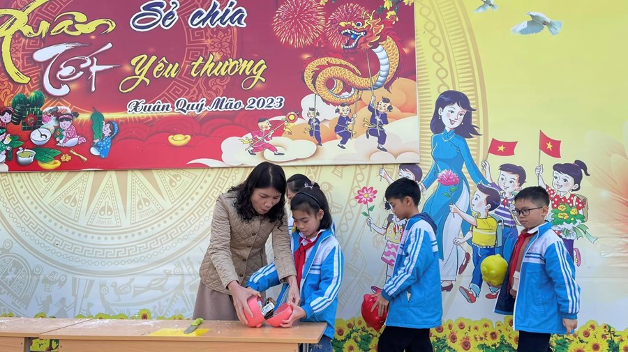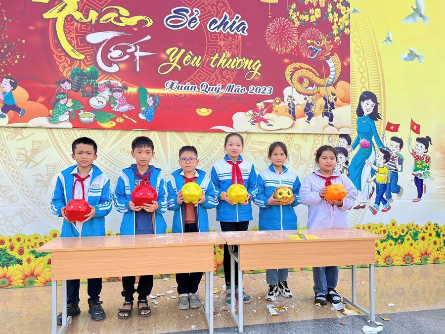 Cùng với giáo viên chủ nhiệm của mình, đại diện học sinh các lớp đã tập trung những chú lợn được nuôi từ những phần tiền mùng tuổi nho nhỏ của các bạn trong lớp về sân khấu và cùng nhau thực hiện mổ lợn siêu trọng